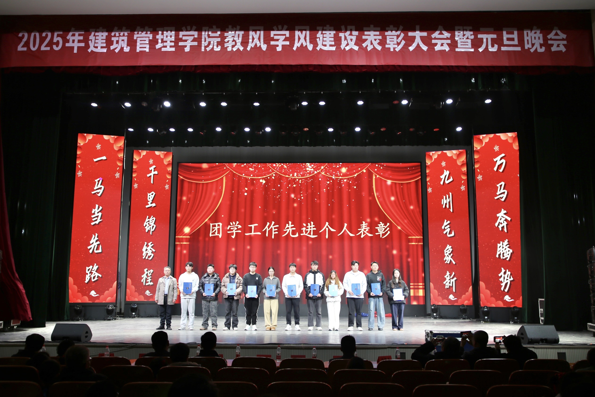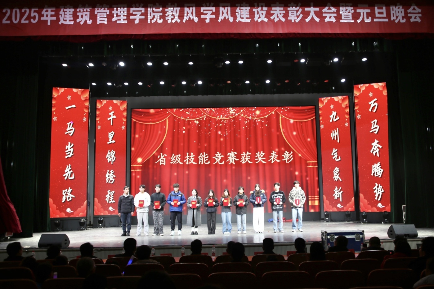 12月28日,建筑管理学院2025年度教风学风建设表彰大会暨元旦晚会在学校会堂举行。江苏建筑职业技术学院学工处处长娄志刚、团委书记蒋德平、教务处副处长曹洪吉应邀出席,学院领导班子与师生齐聚一堂。